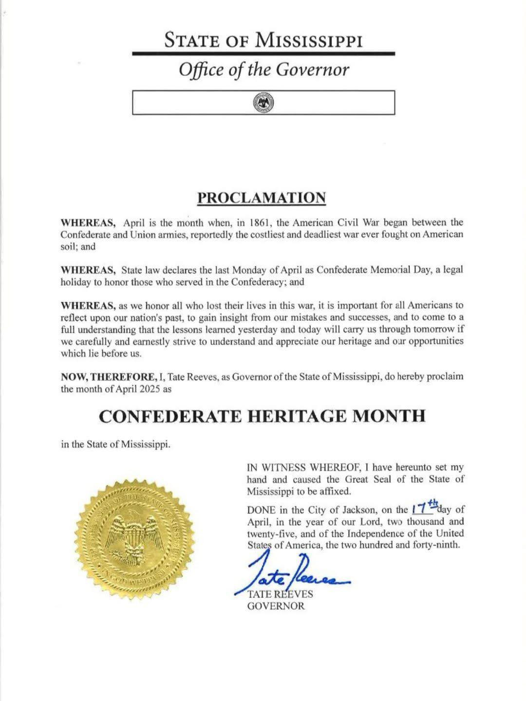 “Now, therefore, I, Tate Reeves, Governor of the State of Mississippi, hereby proclaim the month of April 2025 as Confederate Heritage Month in the State of Mississippi.”