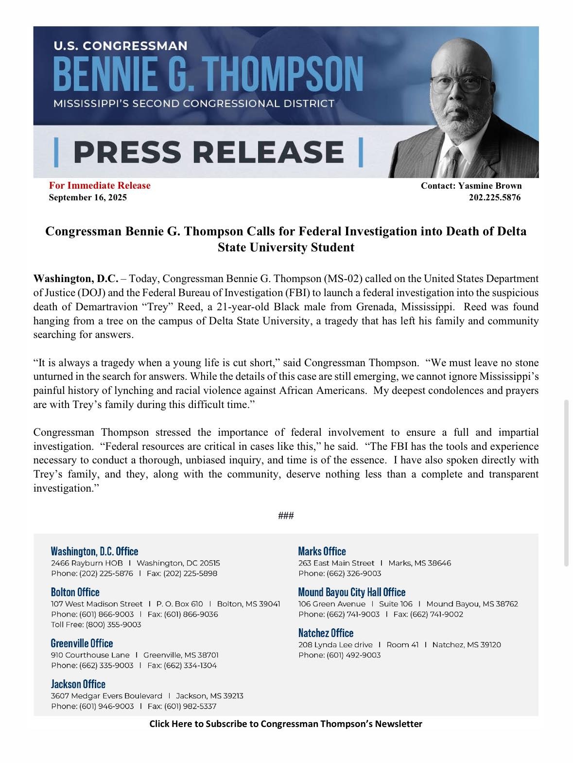 U.S. House Rep. Bennie Thompson, whose district includes Grenada and Bolivar counties, calls for a federal investigation into Trey Reed’s death.